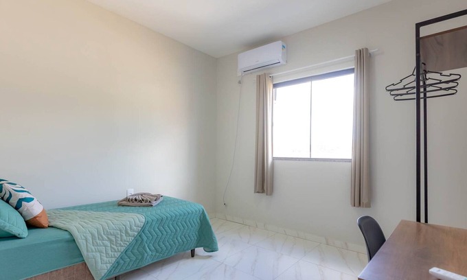 Imagine abrir a porta do seu quarto e encontrar um espaço aconchegante, bem iluminado e projetado para proporcionar a melhor experiência de estadia em Brusque. Seja para um descanso após um dia intenso ou para uma estadia prolongada, este quarto privativo foi pensado para atender às suas necessidades com conforto e funcionalidade. O ambiente conta com ar-condicionado, garantindo uma temperatura sempre agradável, e uma cama confortável com roupa de cama de qualidade, proporcionando noites tranquilas. O banheiro privativo oferece total privacidade, enquanto a cozinha compartilhada bem equipada permite que você prepare suas próprias refeições com praticidade. Para maior comodidade em estadias mais longas, o prédio dispõe de uma lavanderia, tornando sua rotina ainda mais fácil.