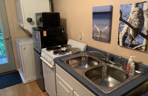 In beautiful Boothbay, Maine, home away from home: Queen efficiency apartment , new Nectar adjustable bed, with ac, washer dryer and full kitchen area. Boil lobsters and enjoy on the deck! Comfy queen bed, all cotton linens and towels washed and dried in the sanitize cycle. UVlight used after each guest leaves. May use thermapedic twin bed in in foyer for $45 a night . Portacrib, booster seat, child utensils available on request WIFi, ROKU , dvd, 6 miles fromBoothbay Harbor and 4 miles to Botanical Gardens.