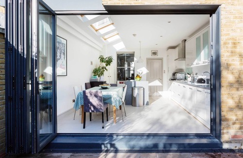 The kitchen and dining space includes a large kitchen island, ample space and a dining area, by the bi-folding doors which lead out to the garden. The space enjoys plenty of natural light from the doors and skylights above.