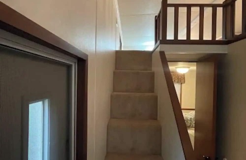 One bedroom with a Queen bed and a loft with a full and twin sized mattress' for the children, it is best for children only as the loft has very low ceilings. One full size bathroom with tub.
