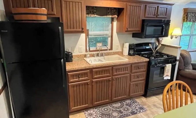 Full Kitchen with gas stove, microwave, coffee maker, toaster and full size fridge.The property does not have WiFi. Verizon hot spot works great!