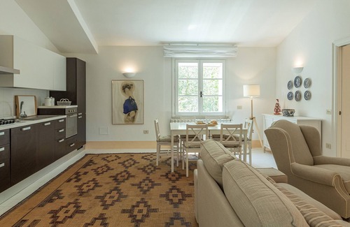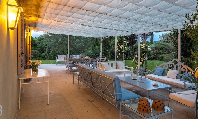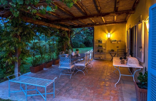 Quercia Felice is set in a 7-hectare estate consisting of a large 2-hectare garden with lawn, beds of roses, rosemary, wisteria, lavender, maritime pines, oaks and an olive grove with 700 plants that give an excellent organic extra virgin olive oil. Past the electric entrance gate, an avenue of cypresses leads to the 6-car parking area covered by a pergola. At the edge of the park, in the portion inhabited by the owner, is a kennel for the two dogs of the estate.Please notice that photos are taken in spring, therefore flower blossoming, and the colours of the gardens' grass could be different at the moment of your arrival at the villa.