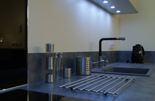 Modern kitchen: fully equipped, oven, microwave, fridge, dishwasher, all built-in.