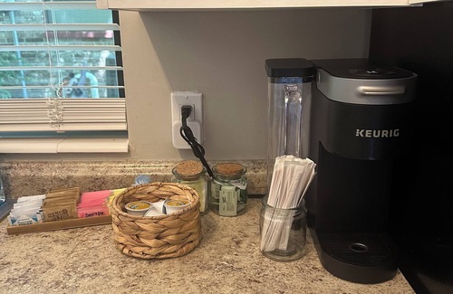 This 2-bedroom, 2-bathroom unit boasts a spacious layout, featuring a full kitchen equipped with all essentials for your culinary needs. Includes a keurig coffee machine with plenty of coffee kcups, tea, sugar, and creamer options as well as appliances like a toaster, blender, toaster oven, and electric kettle. Enjoy meals in the dining area or use the space to work!