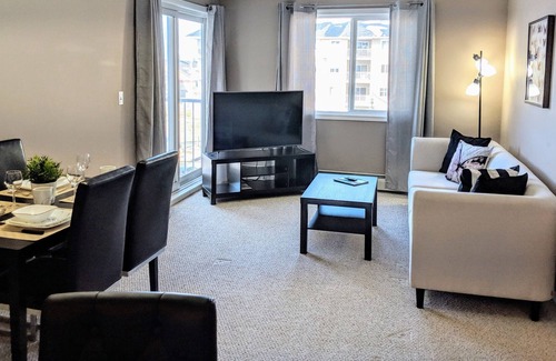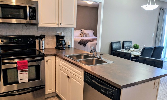 Newly Furnished 2 bdrm/2 bath condo equipped with is equipped with towels & linens, bath & shampoo, laundry, high speed internet and cable TV (50" 4K). You won't find a better location to stay in Stony Plain!