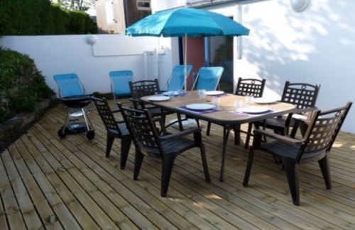 - A wooden terrace with a large resin and metal table and 6 resin chairs, and an outdoor shower (cold water)