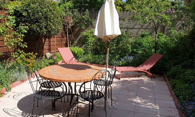 Garden with terrace, table and chairs, umbrella, barbecue, lounge chairs and deckchairs, accessible from kitchen and also directly from the street.