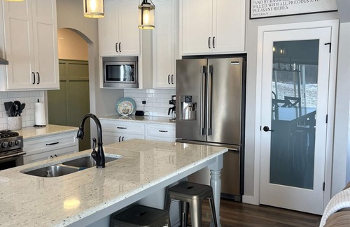 Outside security cameras, plenty of driveway parking. The kitchen is equipped with a gas stove/air fryer (setting), refrigerator, microwave, coffee pot/Keurig, dishwasher, as well as all kitchen utensils. Living room has reclining couches and satellite TV.