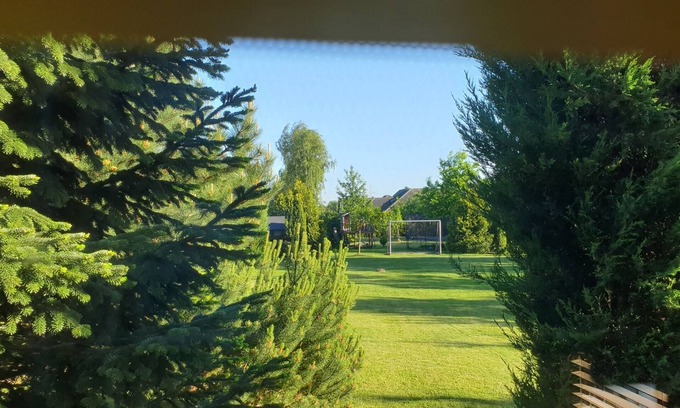 The modern apartment is located on a 3000m ² plot about 4 km from the port. The beach, Markgrafenheide, Graal Müritz, Warnemünde, the Überseehafen and Rostock are not far away. The apartment is located in the countryside and in a very quiet location on the outskirts of Rostock, towards the Markgrafenheide beach. Up to max. 4 people (2 adults + max. 2 children) stay overnight. The apartment has its own terrace with 4 x seating, parasol, lounger, a private playground with tree house and a barbecue area and fireplace. The apartment is new and about 46m ². You have a private locked parking space on the property.
