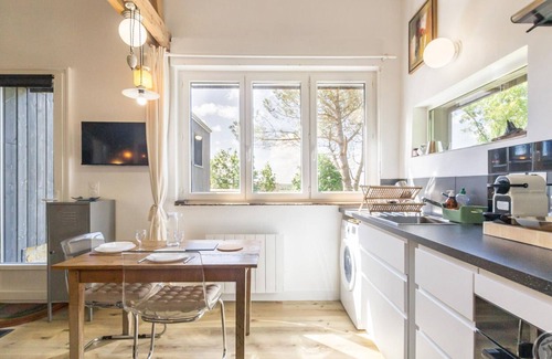 Accommodation adjoining the owner's house. Entirely on the ground floor with 3 steps at the entrance. Living room (TV, Wi-Fi) with kitchenette (2 induction hobs, oven, espresso machine, French press coffee maker, refrigerator, microwave, washing machine). NO dishwasher. Bedroom 1 (160x200 cm bed). Shower room with WC. Baby equipment on request. Electric heating included. Sheets provided and bed made upon arrival. Towels not provided. End-of-stay cleaning service included. Shared unfenced garden. On the side of the cottage, outdoor area not overlooked. Private terrace. Picnic table. Deckchairs. Barbecue. Parking. Accommodation not accessible to people with reduced mobility. On the hillside, the property is remarkably positioned facing the harbor of Regnéville sur Mer and the Pointe d'Agon (natural and protected site). You will surely be captivated by the incredible view that awaits you upon your arrival. Discreetly nestled against the gable of the main residence, a small, pleasant apartment awaits you in this magical setting. Like a treehouse, you'll enjoy this unique panorama every day and appreciate the tranquility and large green space available. The decor is warm and inviting, featuring a few nuggets of reclaimed objects, such as Maud's homemade lamps. In good weather, try to guess the four lighthouses visible from the terrace and explore this superb coastline.