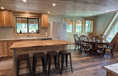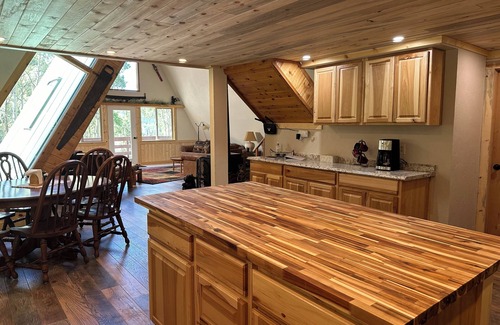 NOTE: rent reduced due to deck construction 6-17-25 to 7-31-25. Email for info. This is a double A-Frame cozy cabin with a great deck that was recently remodeled. There are 1800 plus square feet to call home for your escape. The large great room opens into the dining room and kitchen with many windows to allow for great views of the outdoors. The master bedroom is in the loft with a queen bed and full-size futon. There is a star gazing window over the queen bed in the loft which is very relaxing before you retire at night. The large main floor bedroom has a queen bed. There is a queen and full size sleeper couch in great room. There is a full bath on each floor. The laundry room with washer and dryer is on main floor for your use. A TV with a DVD player in the great room allows you to enjoy your favorite shows during your down time.