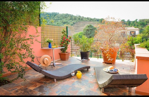 Close to the beach (250m) the apartment is located on a path very little used by cars because dead end. The environment is serene and bucolic, very green. The path leads through the vineyards, on one side to the hiking trails overlooking the bay of Collioure (plans made available by the owner) and on the other side to beaches (250m) and village (center 10mn to foot). Shops are at 200m: bakery, grocery store, bars, restaurants, pharmacy, anchovy trade, tobacco-press .... The use of the car is useless because the amenities are nearby. From the entrance, nice view on Fort St Elme and the old windmill.