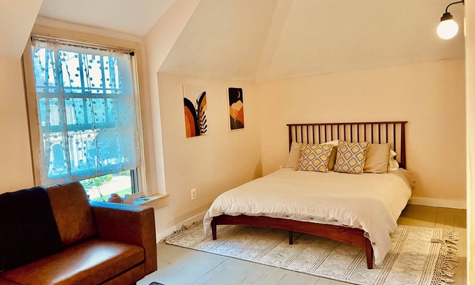 Kick back and relax in this calm, stylish space. You'll have a private space in a detached carriage house, sharing a yard with the host.