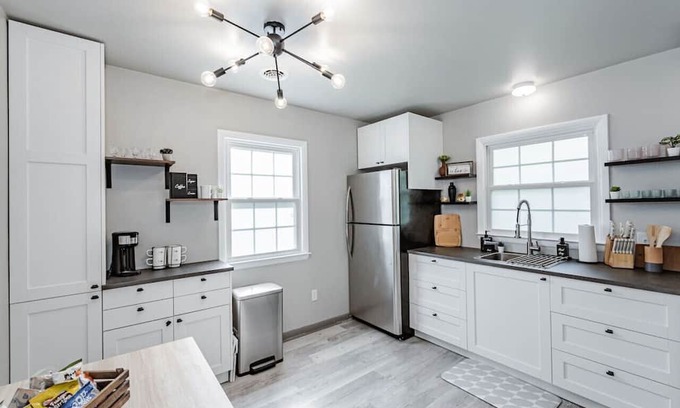 - The kitchen is stocked with essentials and basics, including over 20 spices, plastic wraps, storage baggies, coffee, tea, sugar, and creamer.