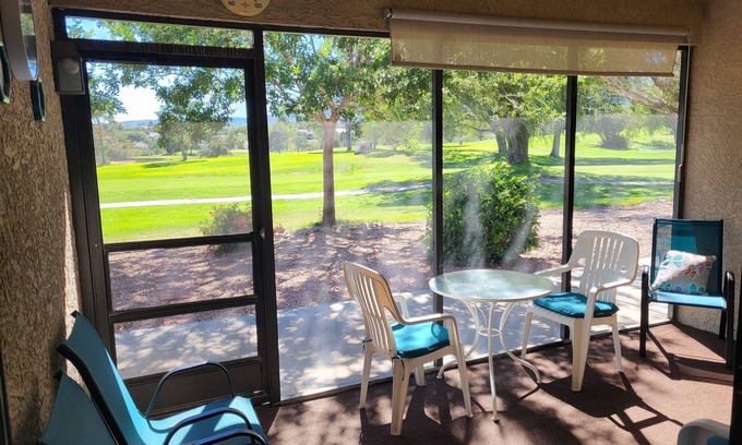 Great spot for a golf vacation or just enjoy sunny skies and fabulous golf course views from this comfortable, charming 2 bedroom condo with screened porch overlooking the 18th fairway at Prescott Golf Club. Two TV's, DVD & CD player. Wifi, Smart TV with your favorite streaming apps. Attached garage. 5 minutes to Prescott Valley shopping & dining; 20 minutes to historic downtown Prescott; Vaulted ceilings, open floorplan, skylights, fully furnished, complete kitchen for your family's fun and relaxation. King bed, 2 twins, queen pull-out sofa, sleeps 6 comfortably. Prescott Golf Club offers reasonable public greens fees; Redwoods Grill features inside and patio dining. Short walk from the condo to the clubhouse and practice area. 80 minutes to Sky Harbor Airport, 77 minutes to State Farm Stadium, 1 hour to Sedona, 50 minutes to Cottonwood, 2 hours to the Grand Canyon. This has been a family vacation home for 24 years, recently refurbished. 4-day minimum. Weekly and monthly discounts.