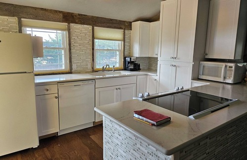 Fully remodeled kitchen is equipped with John Deere dishes and silverware, pots and pans, dishwasher, stove, oven and refrigerator. Also clothes washer and dryer. Natural air conditioning from large trees on property as well as central ac. and internet.