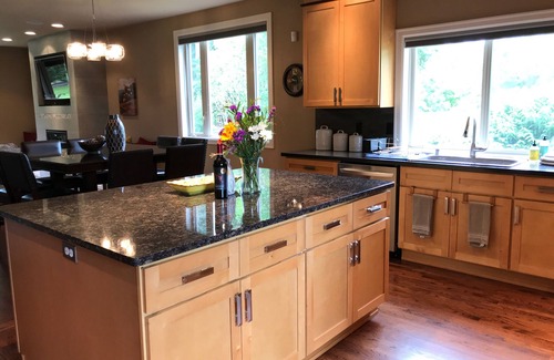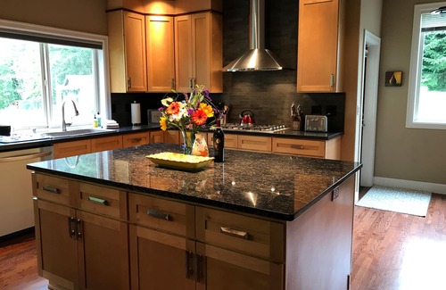 HOUSE: This lovely, secluded, rambler style home will easily accommodate up to 9 people. Beautifully appointed, with new furnishings, beds, linens and housewares. All beds have comfortable pillow top mattresses, down quilts and plenty of extra blankets and pillows. The remodeled kitchen boasts brand new stainless steel appliances and cabinetry, and the kitchen is fully stocked to create everything you could ever need to cook a beautiful family meal! The kitchen also has a brand new Keurig and drip coffee machine. A light supply of coffee & tea will be available upon your arrival. Enjoy a fire in the living room or media room during the fall and winter months and A/C during the summer (a rare treat in the Pacific Northwest). The master bathroom was recently remodeled as well and all showers have a supply of toiletries’ for your convenience. We also have a completely remodeled laundry room and powder bathroom. It features a brand new, large capacity LG washer and dryer, new sink, floor, counters, cabinets and paint. The adjoining powder bathroom is brand new as well, with a new vanity, faucet and sink, toilet, cabinets and also a fresh coat of paint.