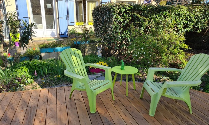 The studio which has its own entrance, gives directly on the large vegetable garden where you can eat (barbecue available) and relax. The river for dipping is 2 minutes walk! Shops 5 minutes walk!