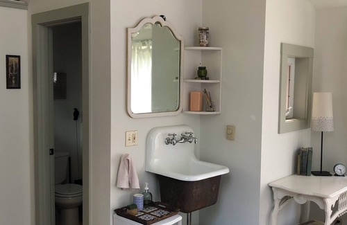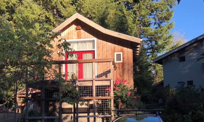 Chill out and relax in this private, converted art studio in the foothills of Oregon’s Coast Range. Private deck overlooking organic garden, greenhouse, fruit orchard and surrounded with Douglas fir, Western red cedar, elderberry and Big-leaf maple trees. Night sky viewing. Quiet walks in the country. Outdoor shower with plenty of hot water, soap, body wash, shampoo and conditioner. Toilet has its own room with vintage, deep enamel sink just around the corner. Kitchenette with full fridge/freezer, two burner hot plate, toaster oven, microwave, French press, fresh ground coffee, creamer and sugar. Pot/pans, dishes/utensils. Lots of art supplies on the shelves to inspire your creativity. Travel/Hiking guidebooks. Watch morning deer in the orchard and a variety of birds at the feeder. I hope to make your stay relaxing and comfortable. I will do the dishes at the end of your stay and also have a washer/dryer available if needed. There are seven steps up to the studio door. The only shower is outside, located on the studio entry deck that’s fenced and curtained for privacy, faces the garden / grapevines and has plenty of hot water. Guests usually love this refreshing experience.