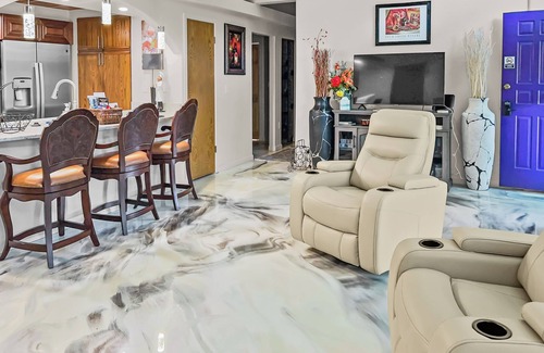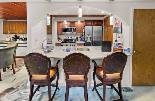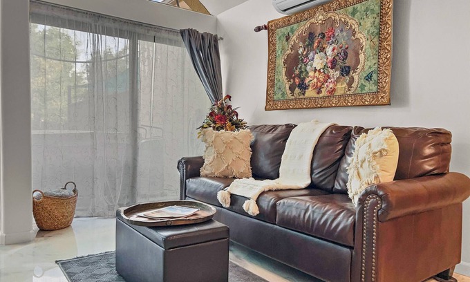 Enter through the automatic gate into a serene, enclosed compound, embraced by lush nature and vibrant flower gardens. As you step onto the shaded terrace, a hot tub invites you to unwind and soak in the tranquility. Once you cross the threshold, you’re welcomed by a stunningly remodeled floor designed to evoke the beauty of a geode, setting a captivating tone for your stay. The living room features a cozy full sleeper sofa, perfect for relaxation, while the fully equipped kitchen has everything you need to prepare delicious meals during your visit. To the left, discover a charming reading nook that doubles as a laundry room, offering a peaceful retreat for book lovers. Indulge in a spa-like experience in the newly renovated bathroom, designed for serenity and relaxation. At night, retreat to the spacious private bedroom, where a luxurious king bed awaits, ensuring you sleep soundly and wake refreshed.