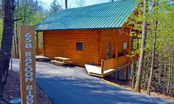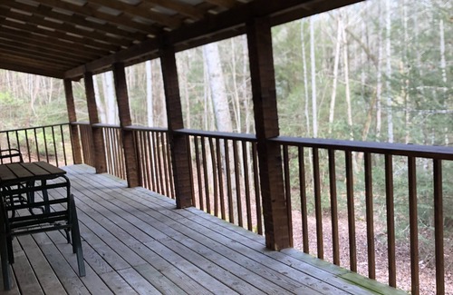 Raccoon Ridge is a 2 bedroom 2 bath with a fully equipped kitchen and full-sized washer and dryer. Each bedroom has a queen size bed and a bathroom on each level. The cabin has wrap around porches with plenty of seats to relax in. We provide a fire-pit and a park style charcoal grill.