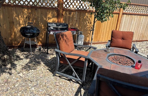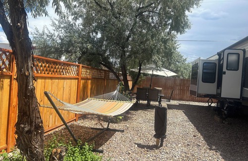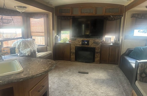 This charming glamper offers a queen bedroom, full bath with shower, and a cozy living room with fireplace and extra sleeping space (queen sofa bed + twin). Stay comfortable year-round with AC, heat, and WiFi, while still enjoying the magic of glamping. Outside, relax in your private yard with a hammock, fire table, and BBQ grill. Rainy day activities are included to help you truly unplug and retreat. Laundry service available. Perfect for extended stays or a quiet getaway with all the comforts of home. Water toys available at no extra cost.