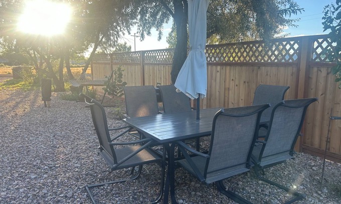 - King Bed-Firepit-Shade-Chairs-Dark Skies