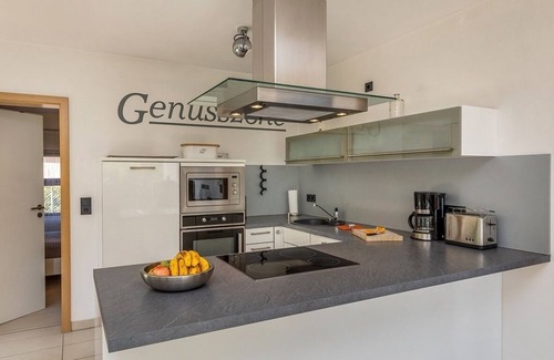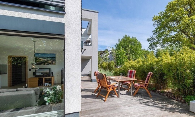 The apartment is on the ground floor of a "Bauhaus villa" on the south-west side. It has a spacious living-dining area with fully equipped kitchen, fireplace and TV as well as 2 separate bedrooms, each with its own bathroom, in the larger bedroom there is a sauna. There is a spacious terrace around the apartment.