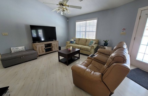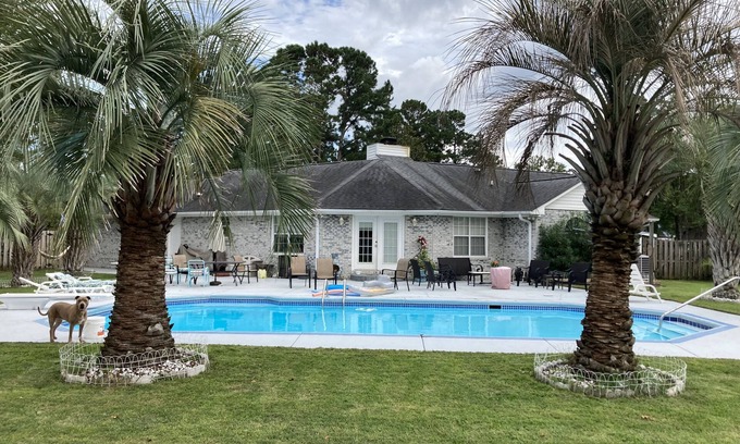 Welcome to "The Resort" as my out of town family calls it. Enjoy a beautiful stay 5 miles from the beach and less then one mile to the waterway boating access. Take advantage of the many golf courses and family fun activities that Myrtle Beach has to offer without the hustle and bustle that large hotel chains bring. The benefit of this is that you have your own private house with a huge private inground pool and fenced in yard. The Master Bedroom has a King size bed with a private master bathroom equipped with a jacuzzi tub and separate shower. Guest Room number 1 has a queen size bed and a twin over twin bunk bed as well as a TV and lots of storage space for clothes. Guest Room number 2 has Twin over Full Bunk Bed as well as a smart TV. The Sofa turns into a queen size pull out bed as well. Incase you need room for one more we also have an ottoman that pulls out into a twin size bed. All mattresses are covered with mattress protectors for added peace of mind. The hallway bathroom is a shower/tub combination and a half bath is also in the back end of the house known as the “pool bathroom” because it also leads out back to the pool. There is a gorgeous sitting area in the back yard as well as several lounge chairs. Our huge drive and garage have plenty of space to bring your boat or motorcycles. The pool was resurfaced in the summer of 2022. This location is pet friendly.