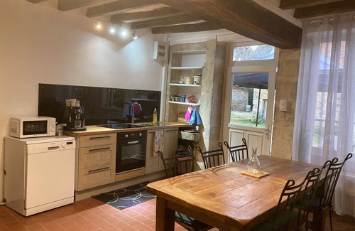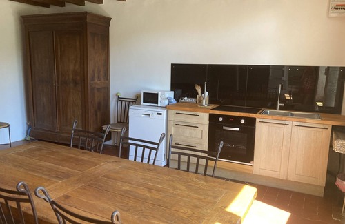 Old restored village farm. Comfort equipment. A house with large interior volumes. A main living room of 60m² (kitchen dining room living room). 2 WCs (1 on the ground floor and 1 upstairs), 3 bedrooms upstairs, in addition the sofa is convertible.