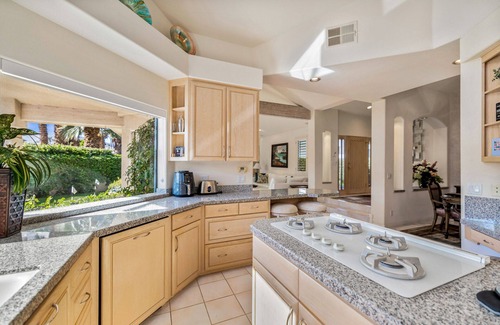 Located within 2 miles of the restaurants and shops on El Paseo, world class golf courses and the BNP Tennis Tournament. Private pool, spa, bbq, and putting green. Home includes an inside gym with elliptical and TV