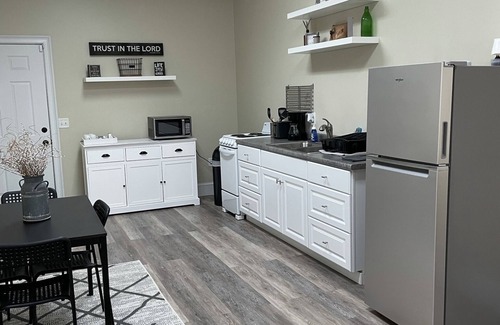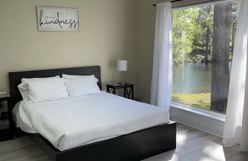 The guest house has peaceful lakefront views from all windows. 2 steps at front entrance. Full kitchen and large open space. Large open windows with black out shades. Near St Simon or Jekyll Islands and Savannah. Clean.