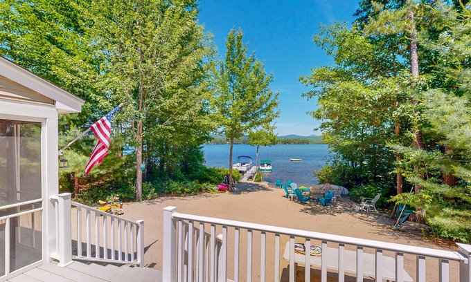 Quiet lakefront home w/private beach, dock, screened porch and stunning views | House in Ossipee