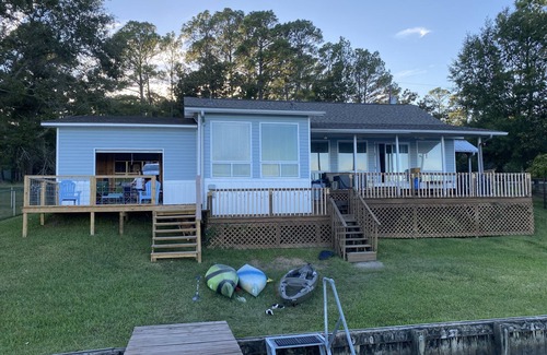 The home is a spacious 3 bedroom with extra large outdoor living areas. Propane fire pit and grill for your outside entertainment. New water Lily Pad is enjoyment for all ages! 3 kayaks available. Private pier with boat dock. The back yard is fenced on the sides and front but NOT along the water edge.