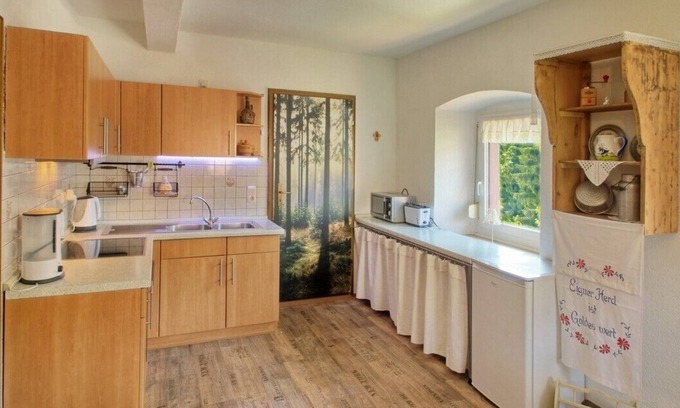 You live in a weaver's house that is at least 130 years old and in which daily bread was earned on two looms until the mid-1960s. Our newly renovated non-smoking house is detached and in a cul-de-sac right on the edge of the forest. Ideal for mushroom pickers and hikers! An extensive signposted network of hiking trails leads you through numerous natural biotopes. Deeply carved valleys alternate with gentle heights and allow beautiful views depending on the season.