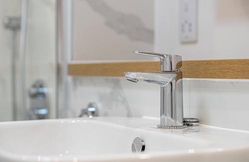The king-size bedroom invites restful sleep with its premium linens, ample storage, and calming colour palette, designed to promote tranquillity and deep rest. The en suite bathroom, finished in stylish marble-effect tiling, features a spacious, step-free shower and a wide doorway, ensuring accessibility and convenience without compromising on design. Together, these elements create a home-like atmosphere that balances luxury and livability.