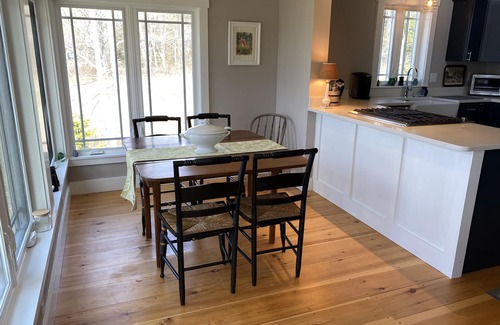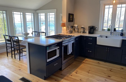 Beautiful Camp Bagaduce isn't a camp, but a lovely and tastefully decorated house, offering a family friendly and comfortable guest experience. Tall windows overlooking the Bagaduce River and the cathedral ceiling complement the open floor plan. The kitchen area includes a full-sized gas stove, refrigerator, and dishwasher. There's one king bedroom on the main floor and an easily-accessed comfortable open loft with three twin beds. The bathroom includes double sinks and a shower. An automatic generator stands ready in case of a power outage.