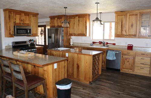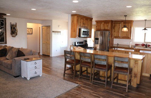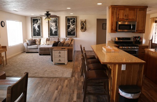 Located at the end of the street next to its sister rental home, this home has very little traffic around it and features fabulous views of the Moab Rim and the La Sal Mountains. There is plenty of parking on the street and driveway. Large kitchen that opens up into the living room and dining room makes the house feel roomy. 2 Large bedrooms comfortably contain 2 queen beds in each and a central bathroom rounds out the rooms in the home. Laundry, Wifi, Cable TV, BBQ grill and patio picnic table are all included for your stay. Only a quick minute from the highway and about 10 minutes to downtown Moab allow quick and close access to anywhere you want to go and explore.