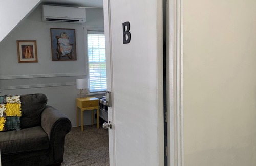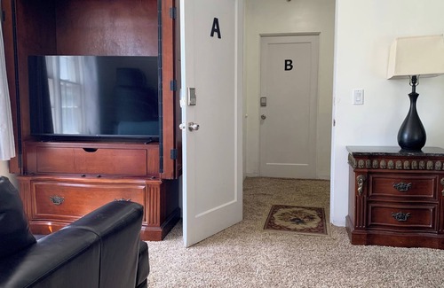 This charming secondsy try- try floor suite features two thoughtfully designed rooms, each equipped with a microwave and refrigerator for your convenience. Relax in the comfortable living space, complete with a king or queen, size bed, a cozy loveseat or couch, a TV, and a dining table with chairs—perfect for enjoying meals or planning your day. Each room boasts its own walk-in closet, providing ample storage for your belongings. For longer stays, you'll find additional drawers available, ensuring you have everything you need at your fingertips. One room includes a dedicated workspace, making it ideal for those who need to catch up on work or study during their visit. Experience personalized comfort with individual mini-split systems in each room, allowing you to adjust the temperature to your liking. The bathroom is between the two rooms and features a large shower. Nestled in a peaceful residential area on a corner lot, our property is surrounded by single-family homes, creating a tranquil environment that feels like a true retreat. The quiet street invites leisurely walks and offers a safe space while being conveniently close to local attractions. Stay connected with complimentary Wi-Fi, whether you're working or streaming your favorite shows. Parking is conveniently available on the street right outside, making your arrival and departure hassle-free. If you only need one room, please notify us so we can offer you a discount.