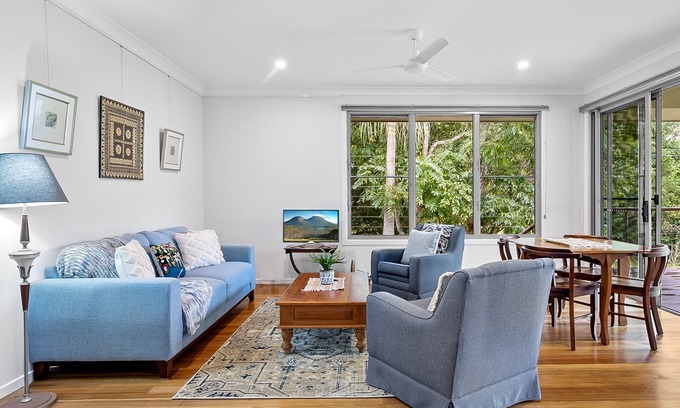 This light-filled guest house features timber floors, soft lighting, and tasteful styling throughout. The bedroom includes a plush queen bed, bedside tables and lamps, and blackout blinds for restful sleep. A well-appointed bathroom and private laundry add comfort and convenience. The living room invites relaxation with a 3-seater couch, TV with streaming access, and gentle tones. Cook with ease in the kitchen, equipped with gas stovetop and electric oven, microwave, dishwasher, and ample cookware. Enjoy meals in the dining area with seating for four. Step outside to the private deck surrounded by greenery—perfect for morning coffee or evening unwinding. Guests also enjoy access to a shared swimming pool, just steps from the house.