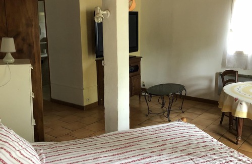 We have a large wooded lot of oaks and olive trees to walk around or kick a balloon ... The property is fenced ... There are vegetables in the garden to eat and share, There are hundreds of m² of terraces, ball game, parking around the house and a 9x4x1,5 m polyester pool (bottom flat) secured by an external electric roller shutter. I propose you a room of 25 m2 independent, a bed 160x200 a table and 4 chairs, room of water with shower has the Italian, toilet, washbasin. A mezzanine to sleep of 5m2 with a bed of 140x190 height 1,20m as needed for two other person .The kitchen is next to the swimming pool equipped and privative.