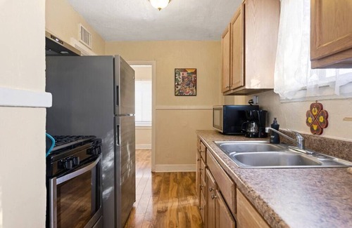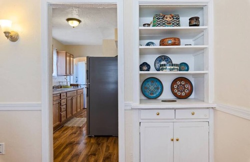 Welcome to your home away from home. Our historic Pueblo Revival is the perfect spot for relaxing, walking to get a bite to eat or enjoying local community art. Step inside into the bright and airy living room complete with original fireplace (decoration only)! Turn on the candles in the fireplace for some ambiance while watching your favorite movie or show on our 55 inch Roku TV.