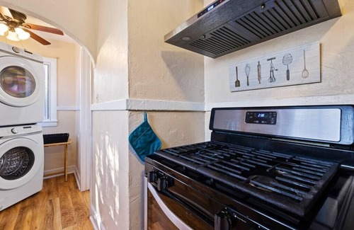 The kitchen has been nicely upgraded and features a microwave, coffeepot, hot water kettle. magic bullet/blender, toaster, gas stove with oven, and full-sized refrigerator. There are ample plates, glasses, silverware and kitchen items. On the far end of the kitchen is a brand-new full-sized Samsung front-load washer and dryer for guest use. We provide laundry pods and dryer sheets.