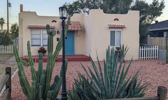 Stay in our charming 1916 Pueblo Revival home near the Garfield Historic District and minutes from Roosevelt Row, sports arenas, and downtown Phoenix. This 2BR/1BA vintage gem features original details, a private fenced yard, gazebo, and outdoor dining area. Full of history and character, it’s the perfect retreat for exploring Phoenix arts, culture, and nightlife while enjoying cozy, dog-friendly comfort.