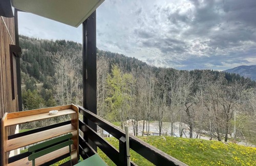 Studio cabin with view of Mont Charvin and the valley. Located in the village of Notre Dame de Bellecombe, all amenities are within walking distance, the playground is 100m away as well as the ski bus stop.