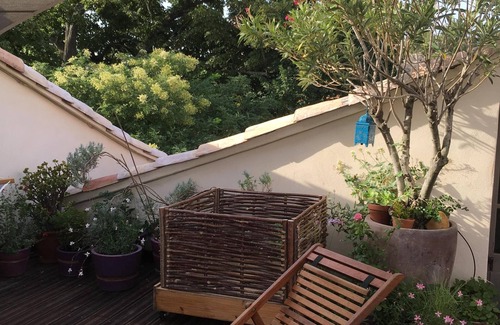 The plus: Access to a splendid shaded wooden terrace, located on the 3rd floor of our house, with a view of the Palais des Papes and the Doms' garden (hammock, summer lounge, plants ...) A haven of rest, ideal for gazing at the stars, enjoying a good tea and savoring the present moment ...