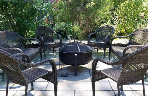 Beautifully landscaped yard with outdoor fire pit/seating area for 6+ people out back. Covered front porch with a simple bench seating in front.