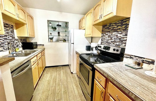 Relax at the Lakeside in this lovely 2 bedroom and 1 bath condo in beautiful Grand Junction, Colorado. The condo complex is in a great central location to everything our grand valley has to offer. The new Grand Junction Temple is within walking distance from the Lakeside. St. Mary’s Hospital, Colorado Mesa University, Suplizio Field and Stocker Stadium are very close by as well. The I-70 interstate nearby will make you only 20 minutes from Palisade, known as Colorado wine country. Within an hour you can be at the amazing Powderhorn Ski Resort on the beautiful Grand Mesa. To the west is Fruita with its world class mountain biking. The Lakeside is the perfect home base for adventure or for a relaxing getaway. The open concept in the main living space is clean and inviting. Warm up in the winter time with a hot cup of tea by the cozy gas fireplace after a great day on the slopes. You can breathe in the fresh Colorado air from the small private balcony. Enjoy a glass of local wine while overlooking the lovely courtyard below and its peaceful waterfall.