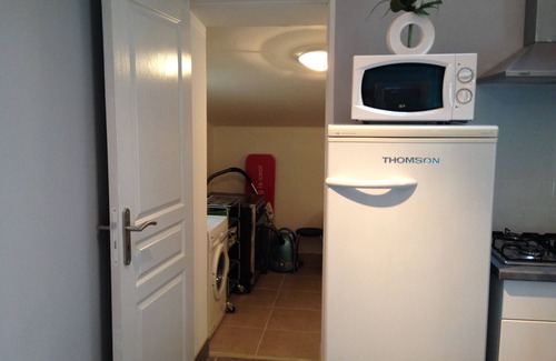 At the back of the fitted kitchen (fridge-freezer, microwave, gas hob, classic coffee maker and senséo ...) is an additional room with washing machine, clothes horse, gas stove with gas oven, storage for your suitcases… ..