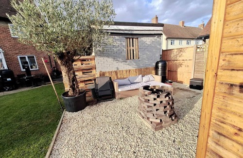 Convenient Amenities: The property features a downstairs toilet, a full bathroom upstairs, and a large garden with a fire pit and seating area. An open fireplace is available from September to June, perfect for cozy evenings.